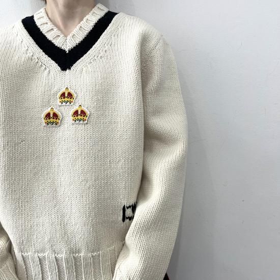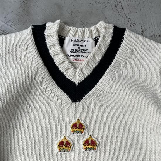 OLDMAN'S TAILOR CROWN V-NECK SWEATER / White × Black